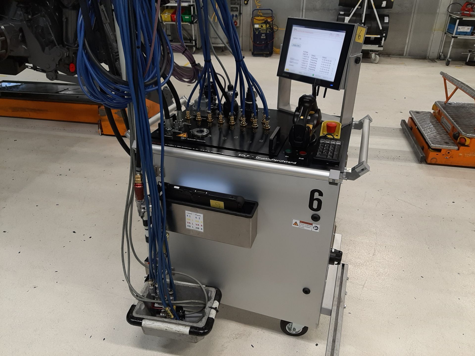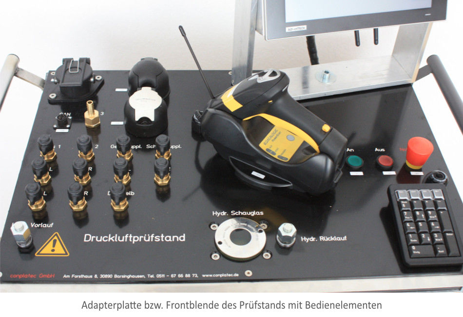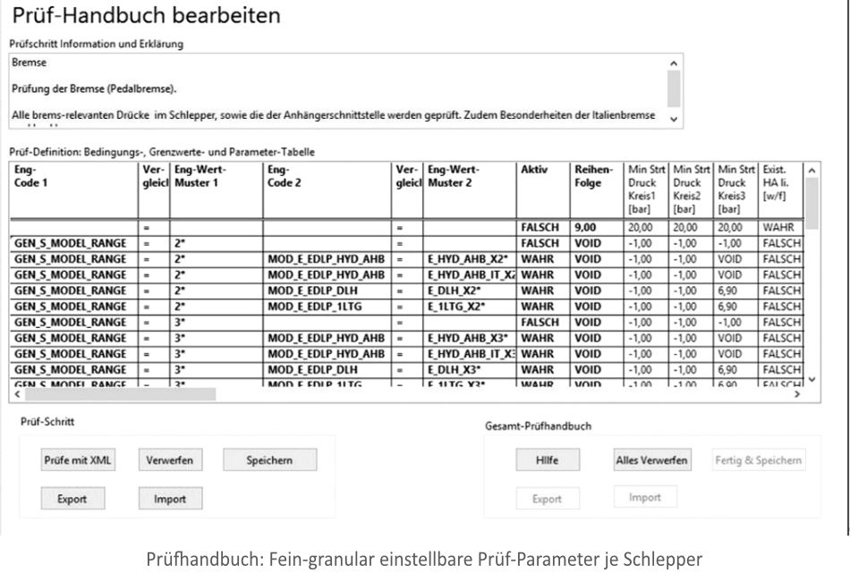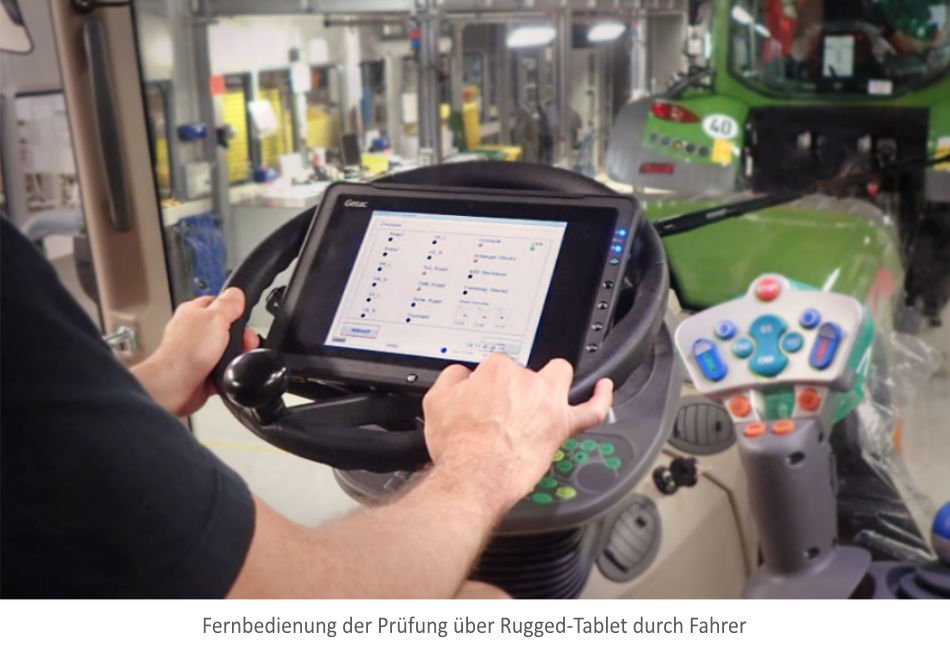 Der prüfende Schlepper-Fahrer bedient ein Rugged-Tablet, das alle Prüfanweisungen einfach und klar darstellt. Der Werker hinter dem Schlepper, der die Schläuche einrüstet, bekommt über einen Bildschirm am Prüf-Wagen genaue Hilfestellung, welche Adapter er je nach Schleppertyp anschließen muss.